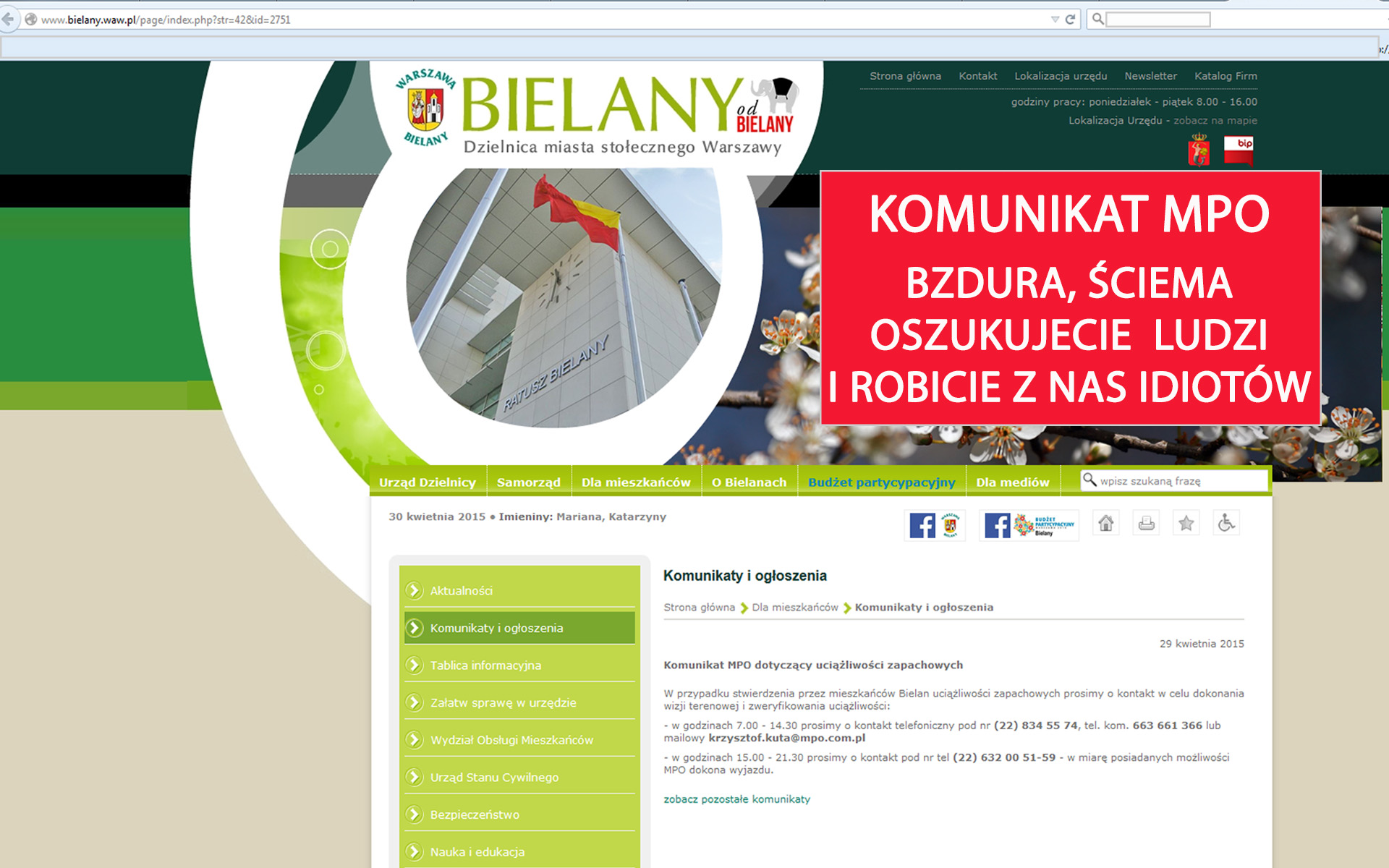 Mijają dwa lata od kiedy mieszkańcy warszawskich Bielan, Bemowa i sąsiednich miejscowości cierpią z powodu strasznego smrodu z kompostowni MPO. Na stronie Urzędu Dzielnicy Bielany od wczoraj widnieje komunikat zachęcający do zgłoszeń mieszkańców o uciążliwości kompostowni. Tak wygląda komunikacja społeczna ze strony miasta i MPO: pod  nr telefonów podanymi w ogłoszeniu zgłaszają osoby nic nie wiedzące o sprawie.